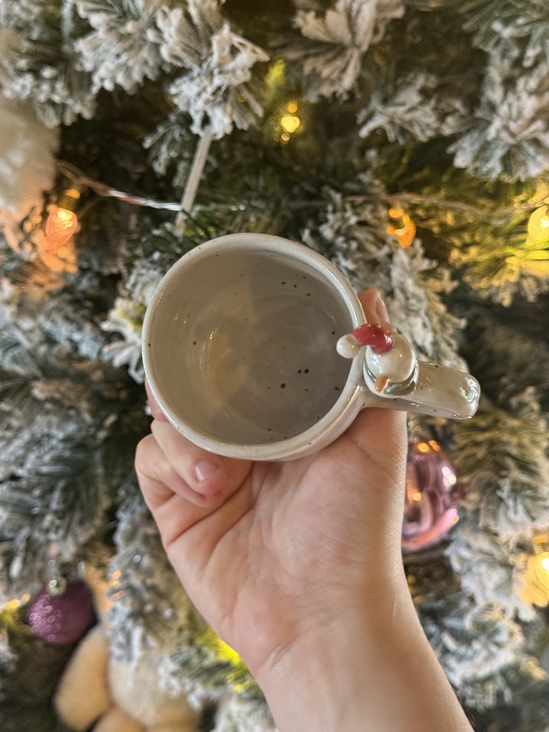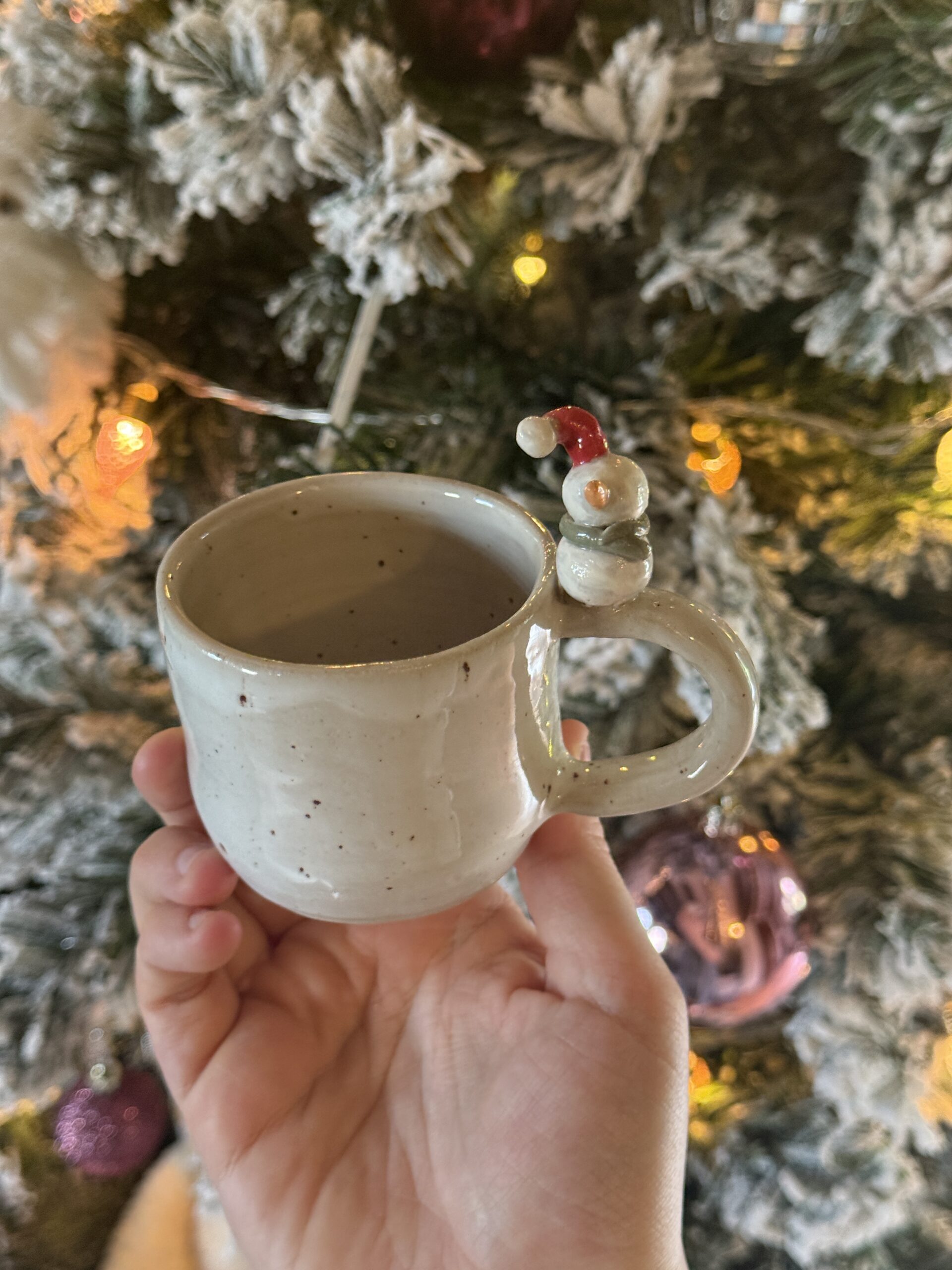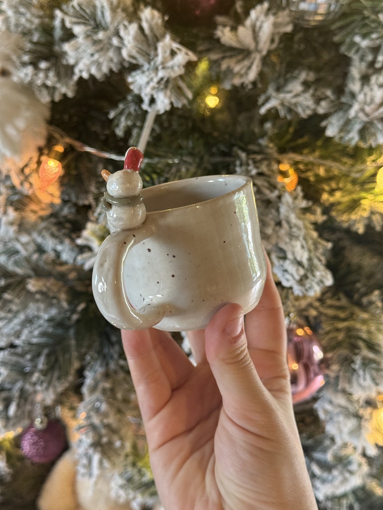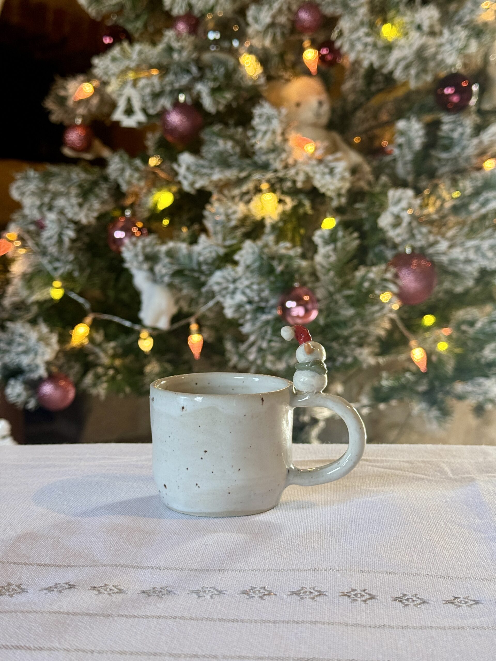 Tasse en céramique tournée à la main, avec un bonhomme de neige sur la hanse.