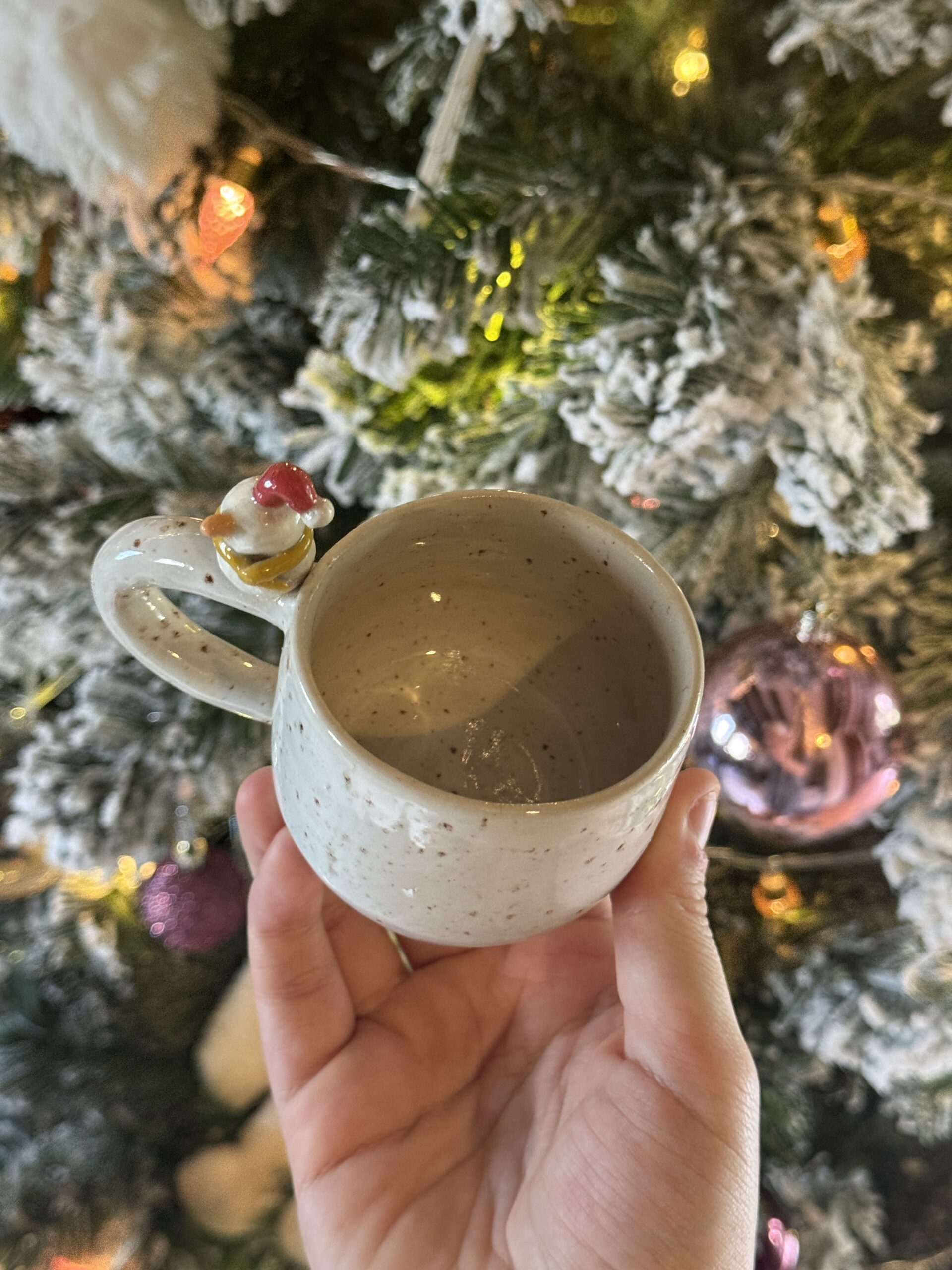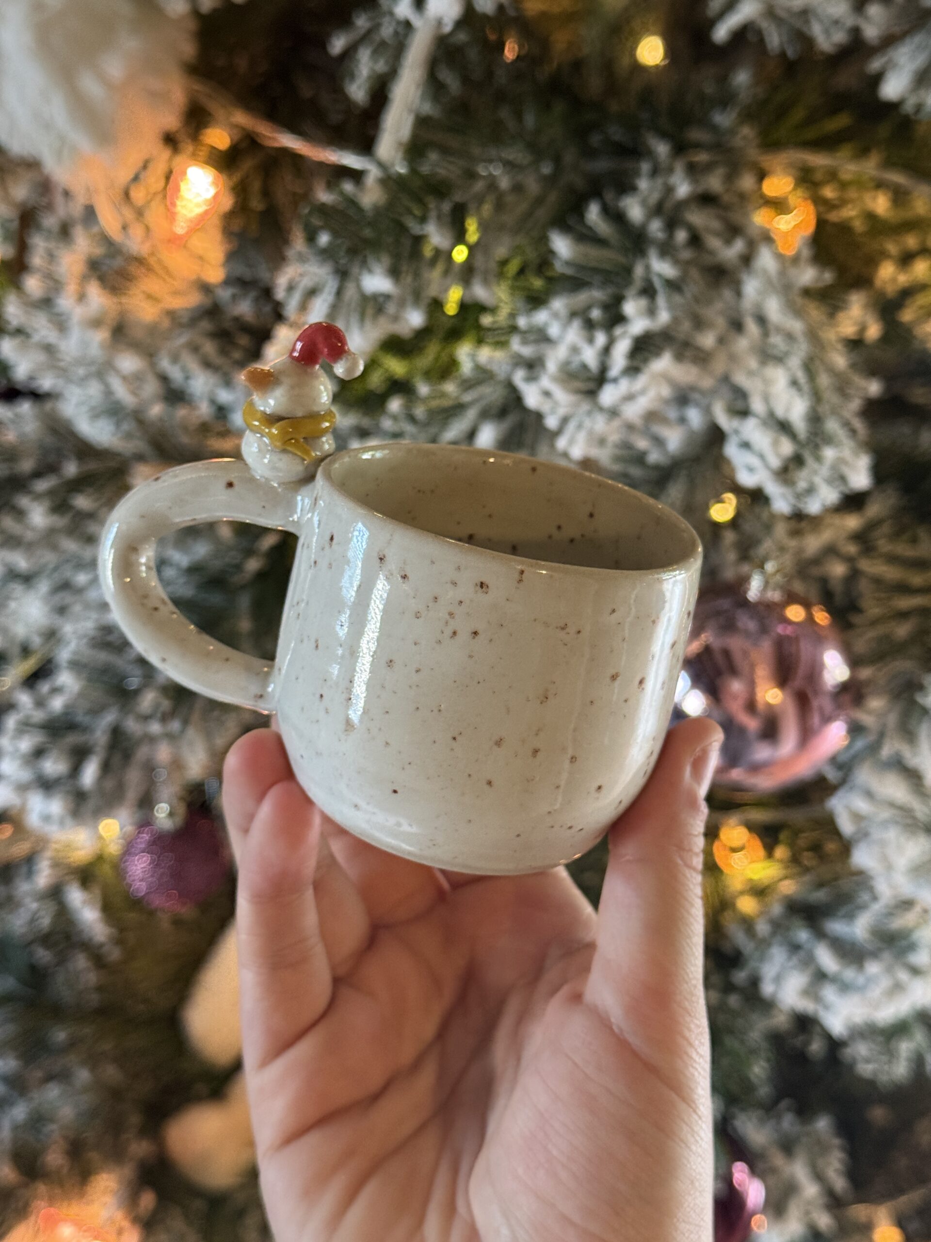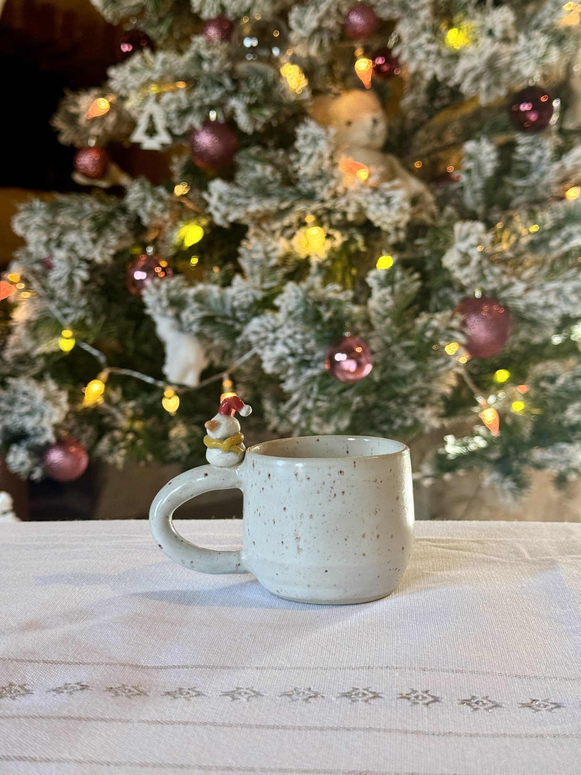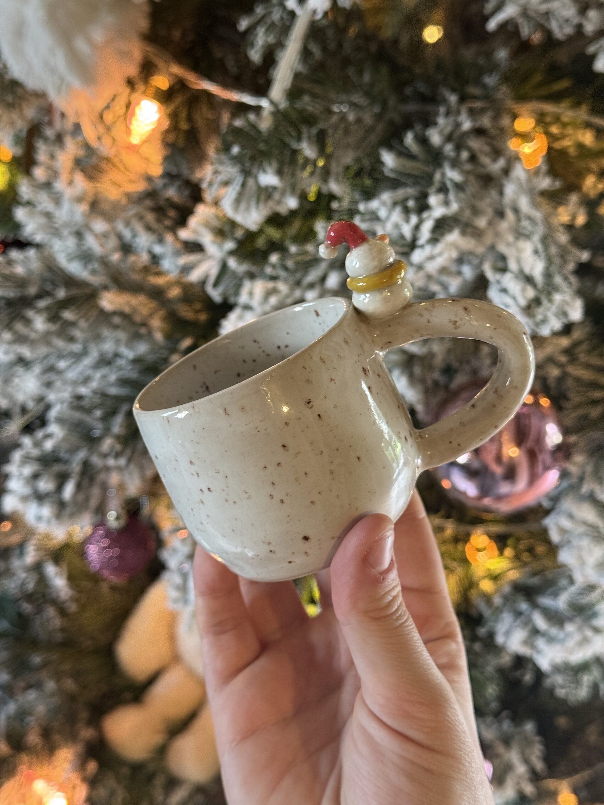 Tasse en céramique tournée à la main, avec un bonhomme de neige sur la hanse.