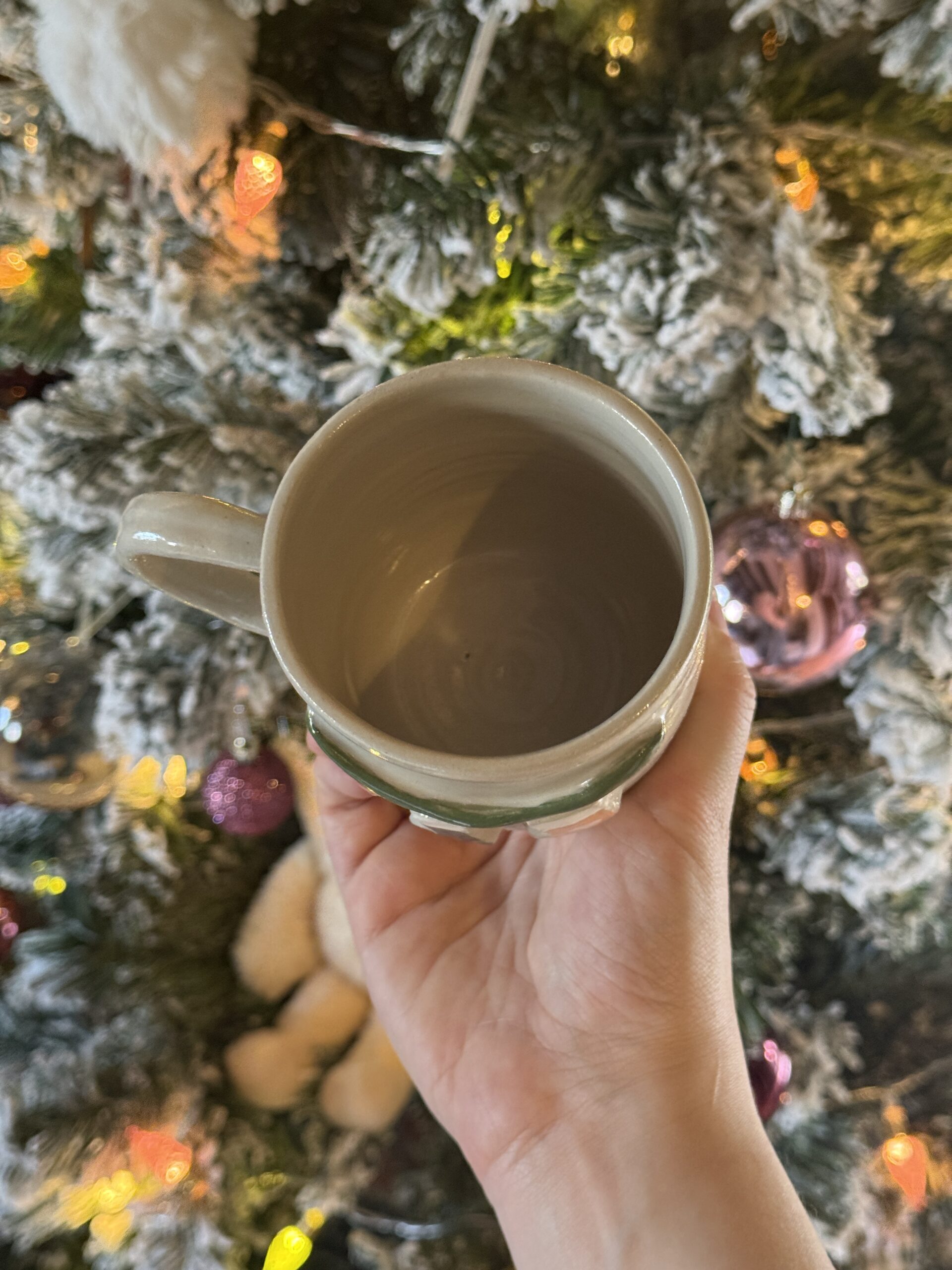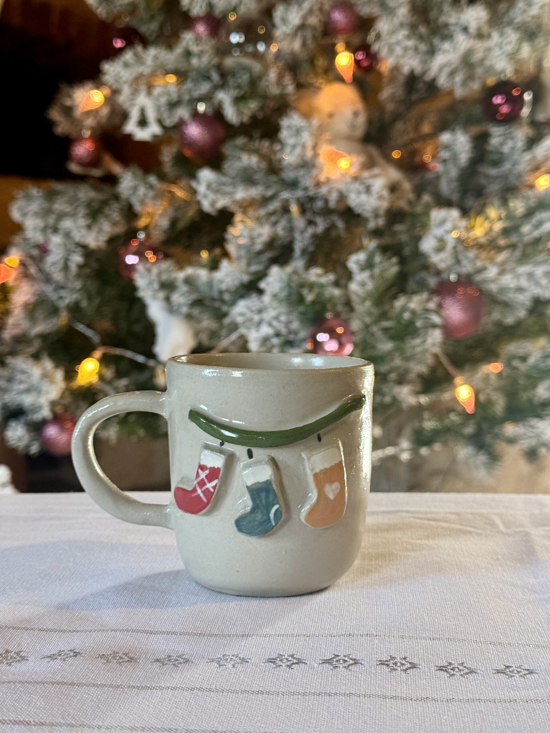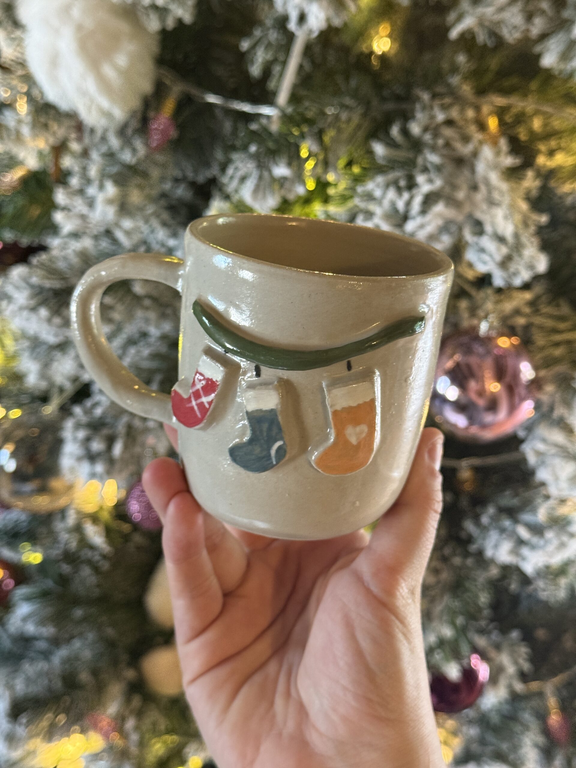 Tasse en céramique tournée à la main, avec des chaussettes de Noël en relief sur le devant.