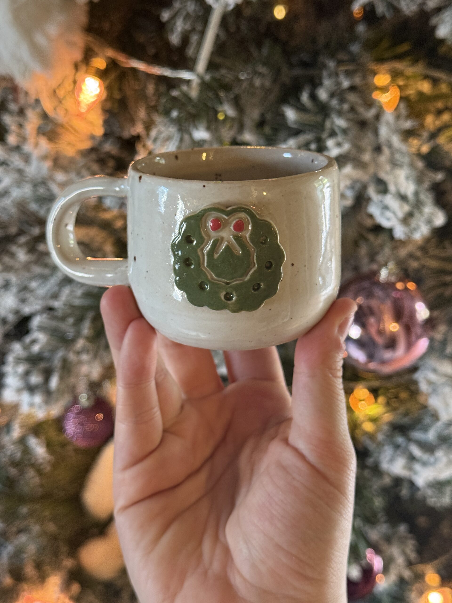 Tasse en céramique tournée à la main, avec une couronne de Noël en relief sur le devant.