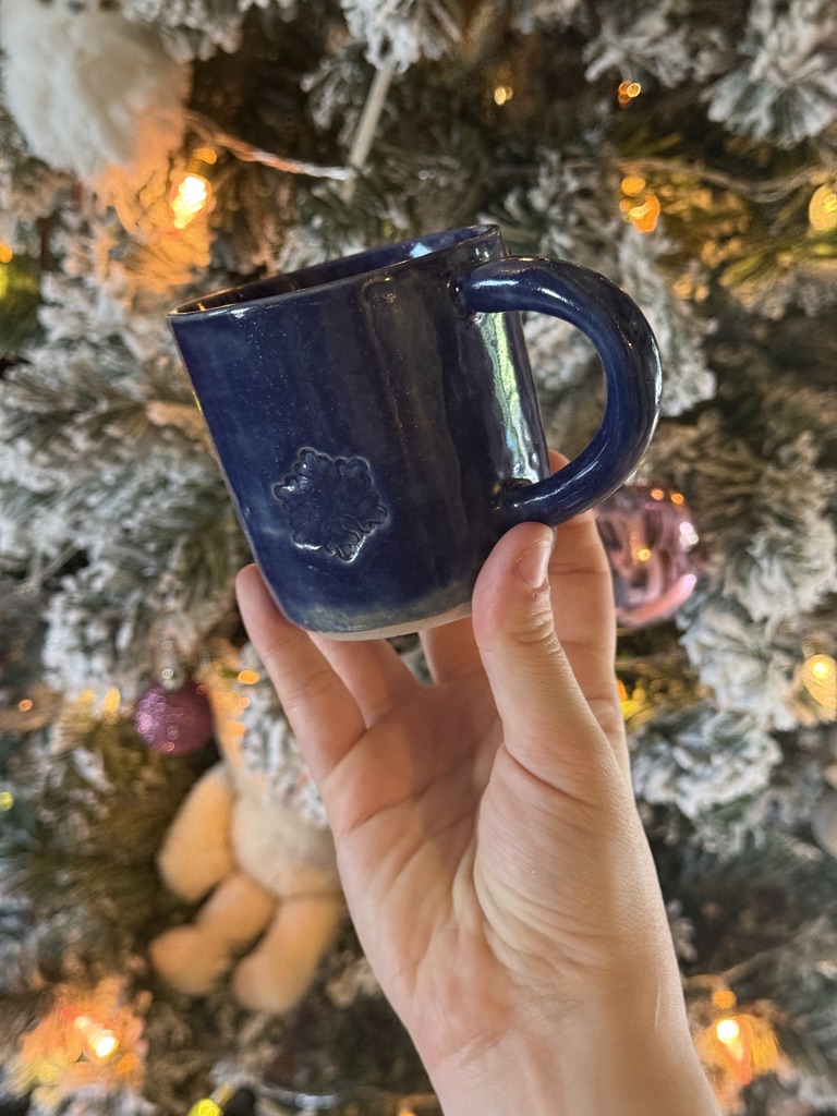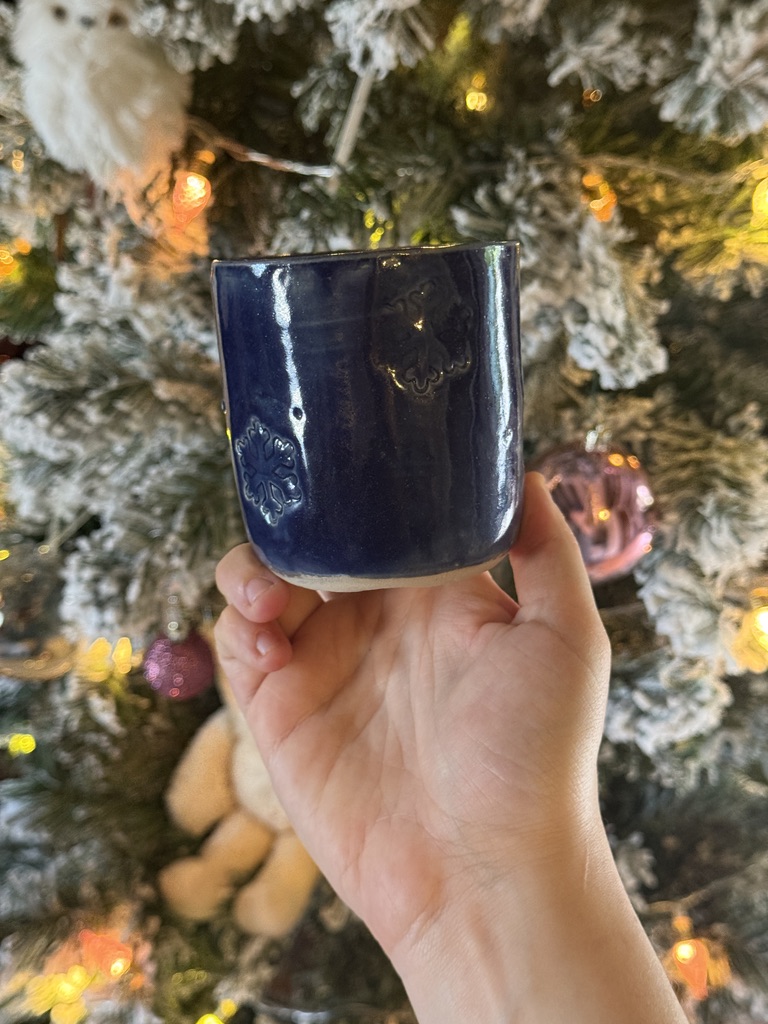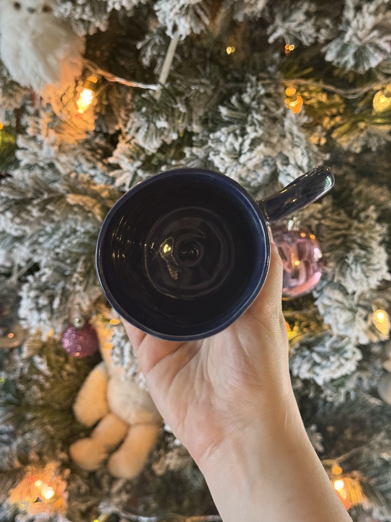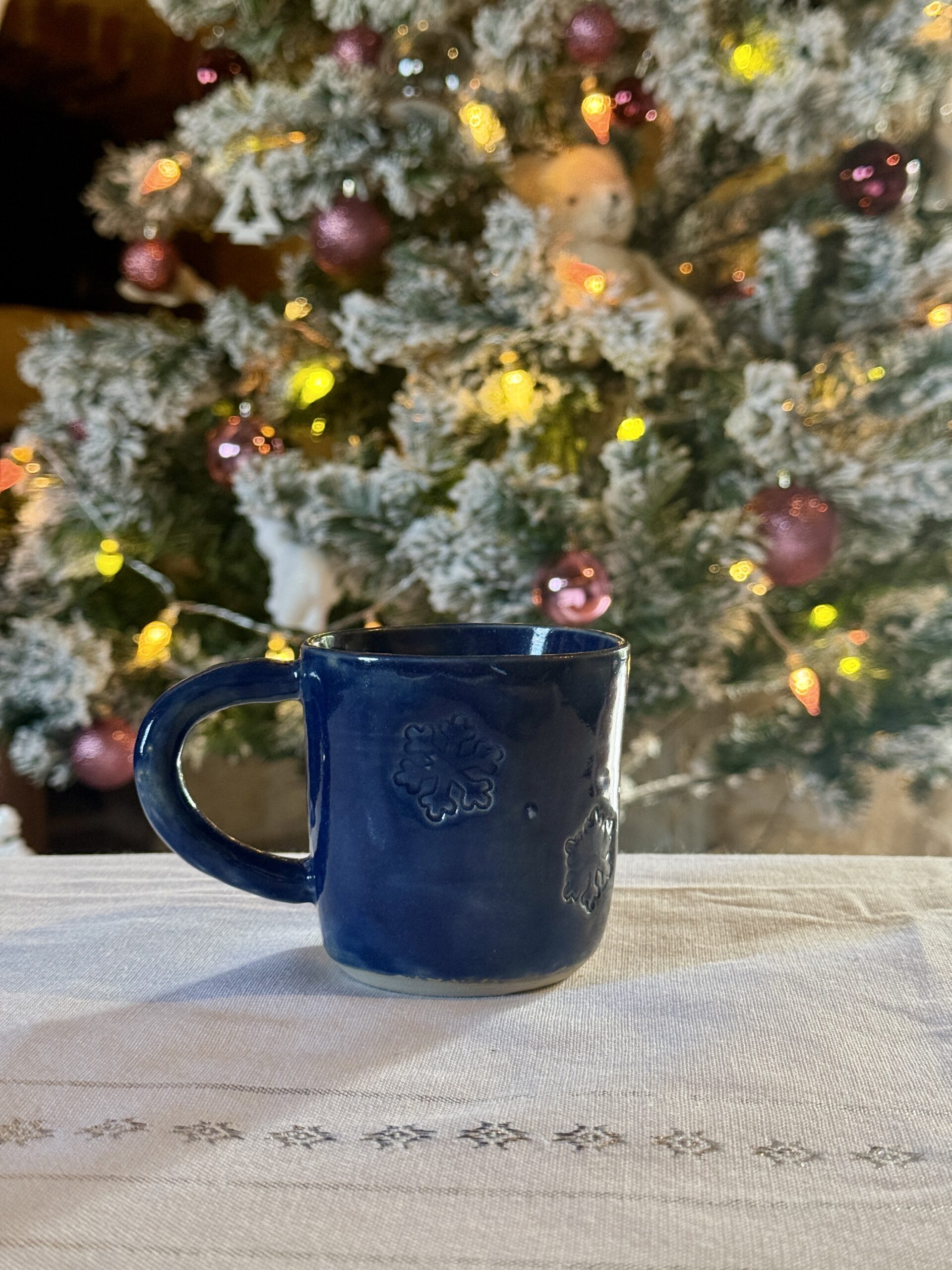 Tasse en céramique tournée à la main, avec des sapins tout autour de la tasse.