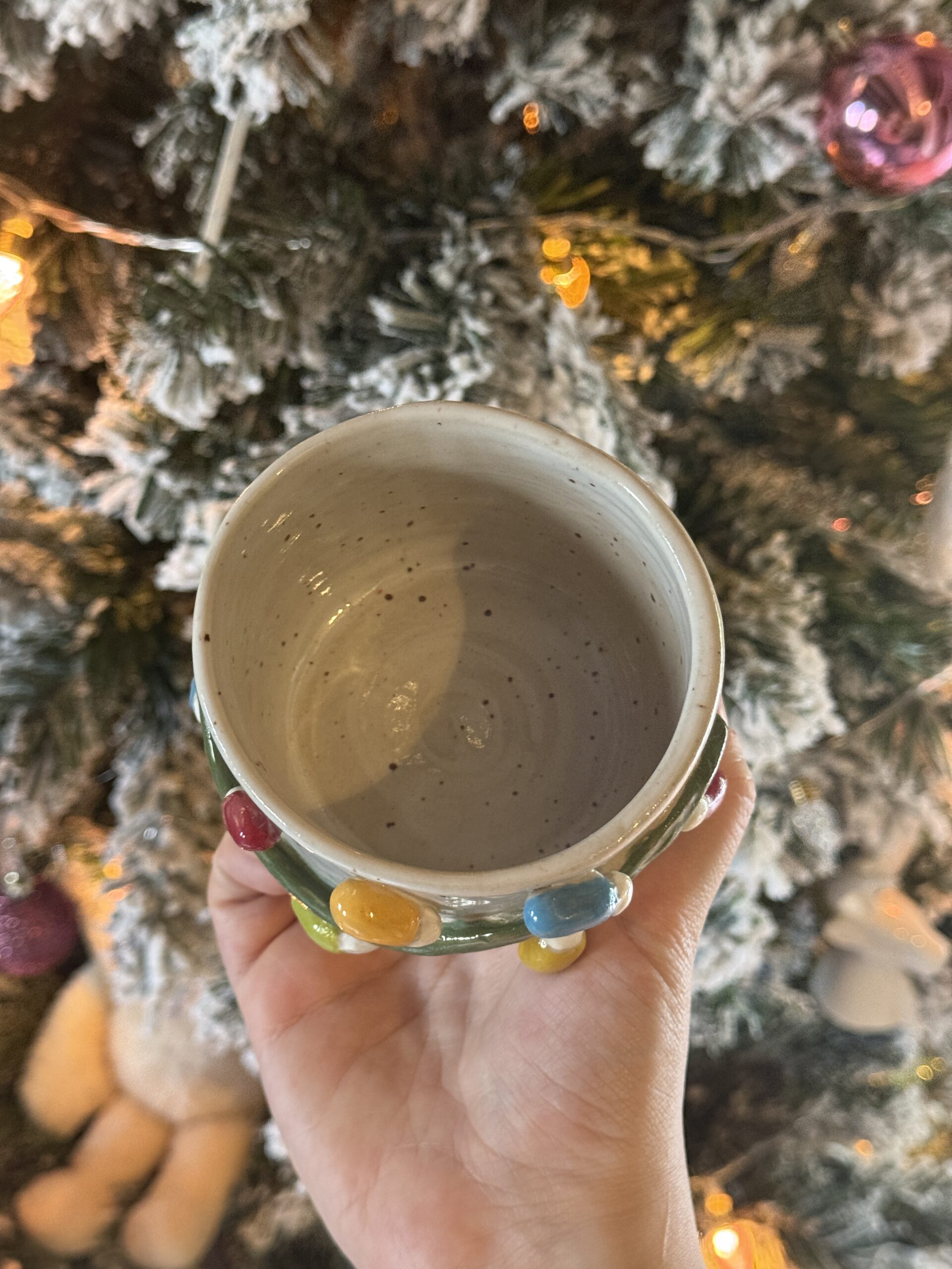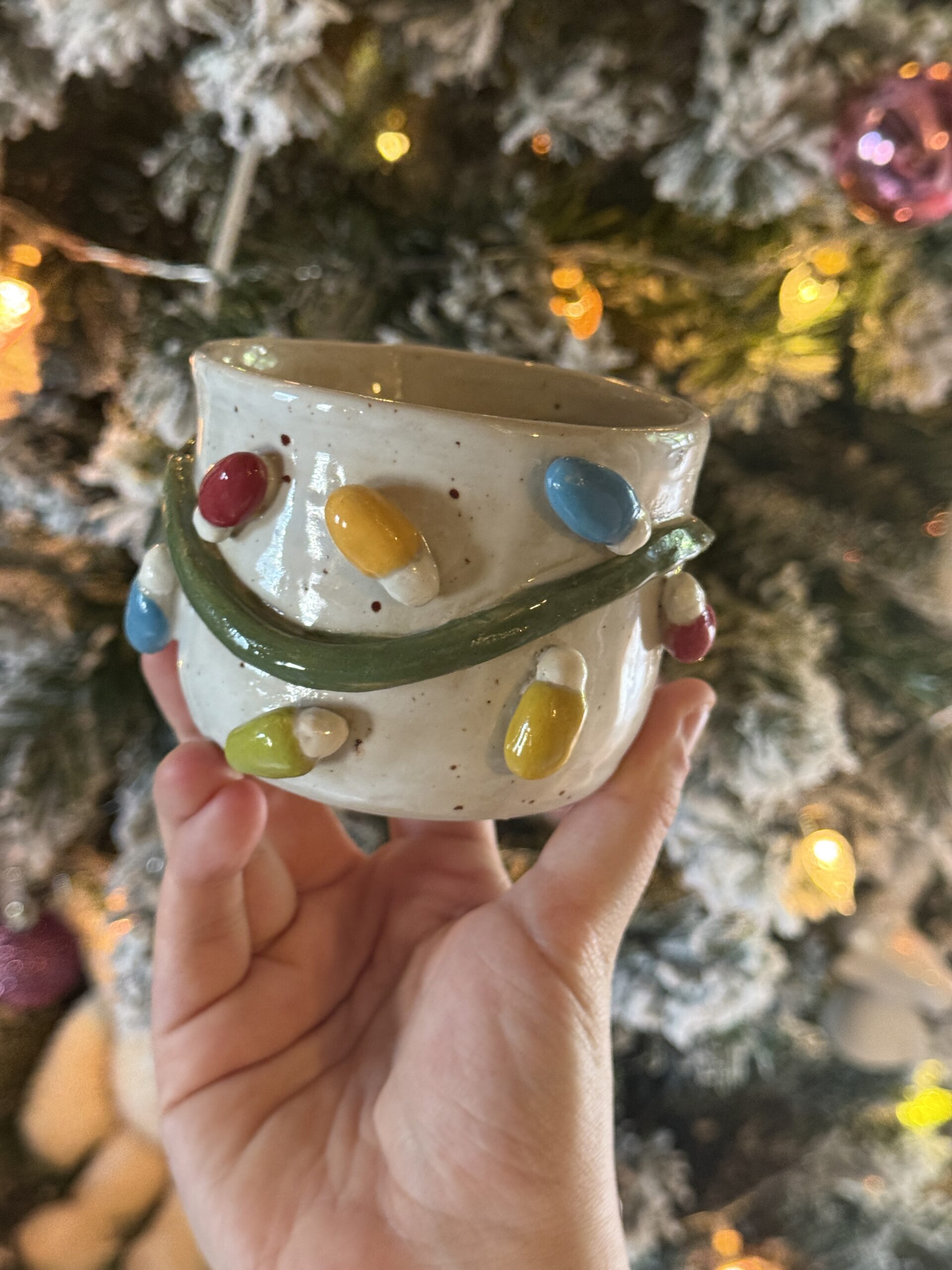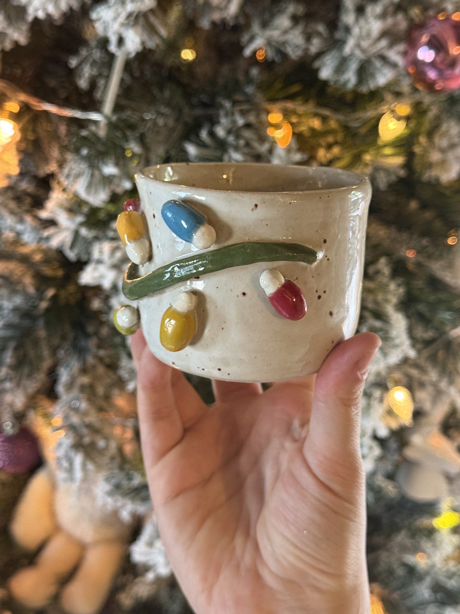 Tasse en céramique tournée à la main, avec une guirlande de Noël en relief sur le devant.