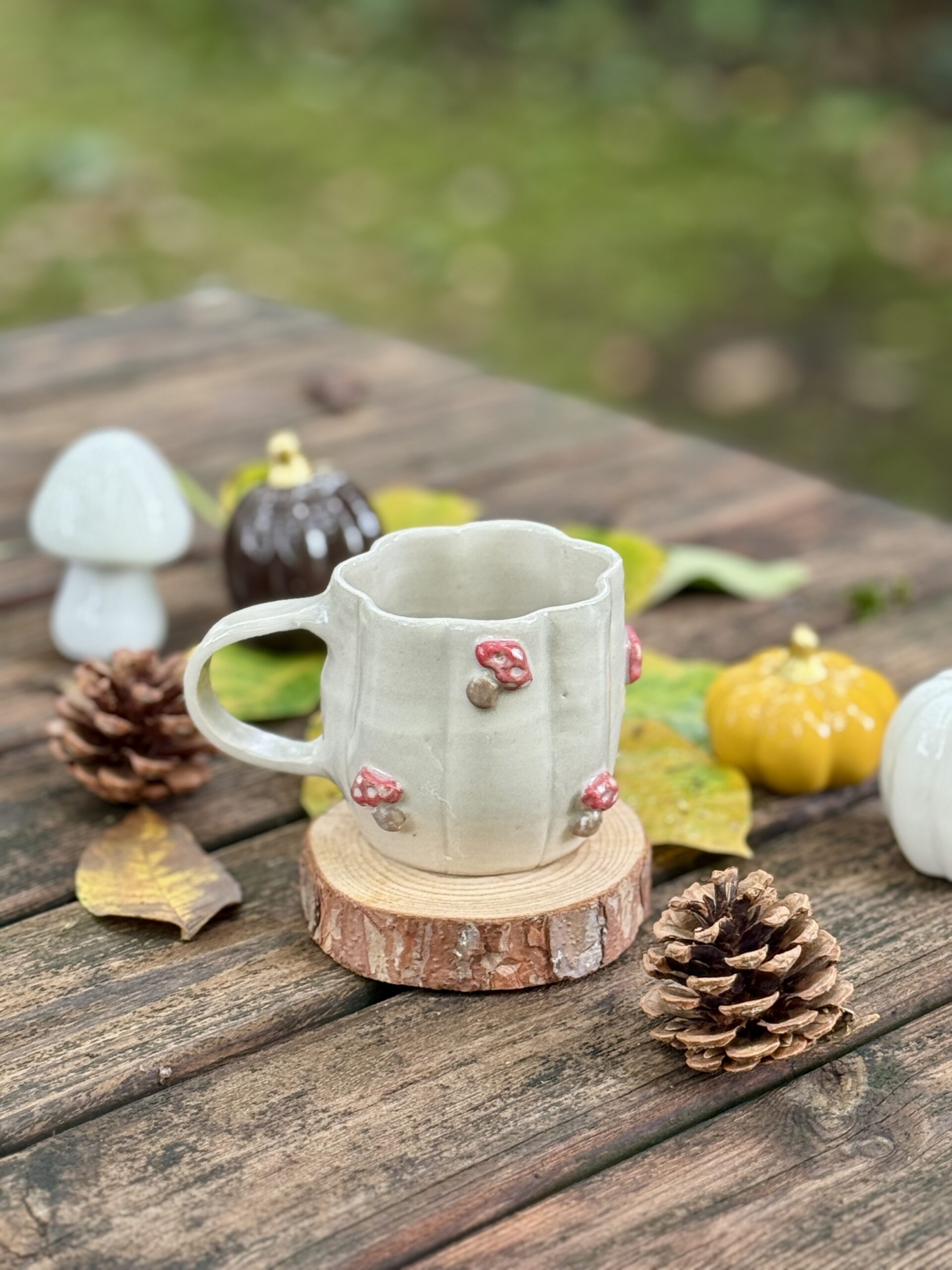 Tasse en céramique tournée à la main, avec des champignons en relief sur le devant.