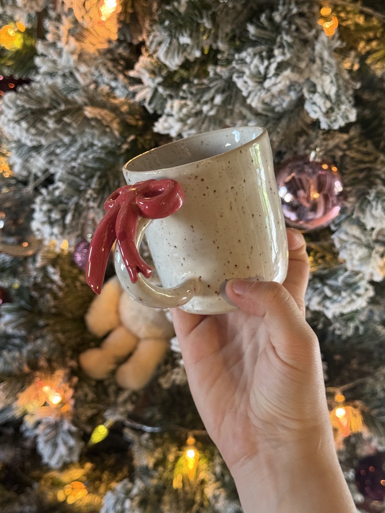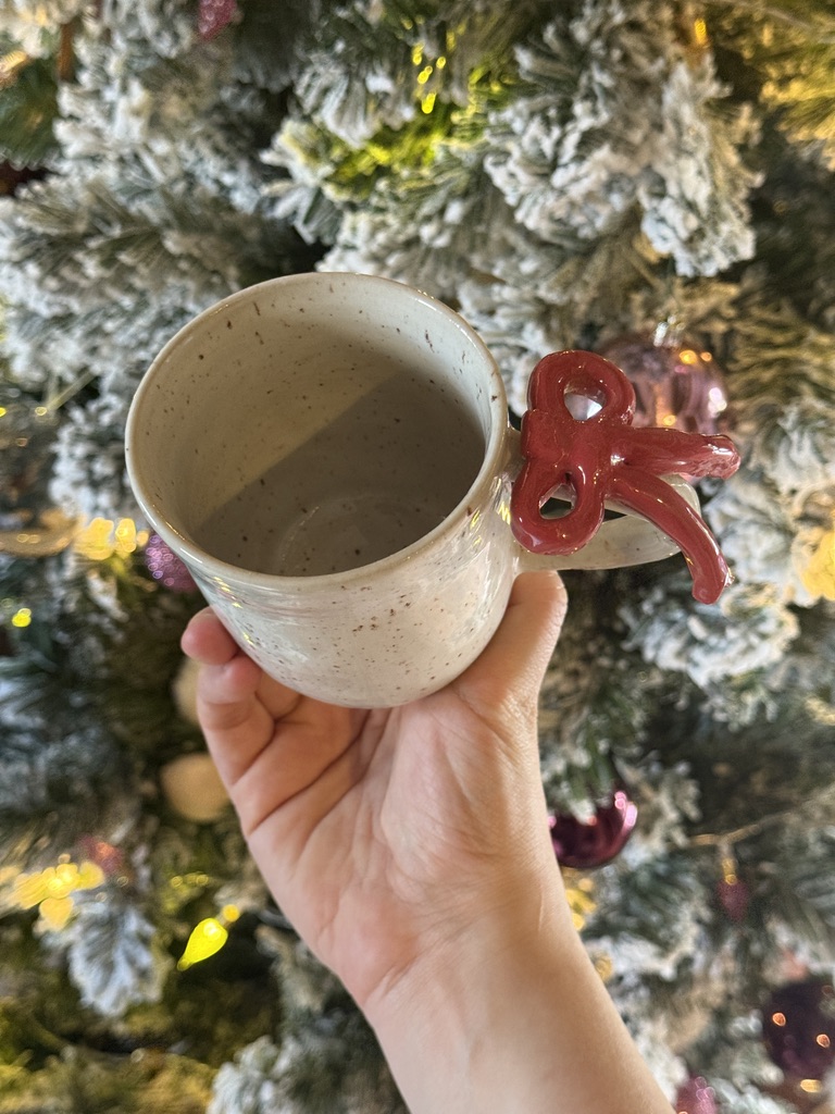 Tasse en céramique tournée à la main, avec un noeud rouge sur la hanse.