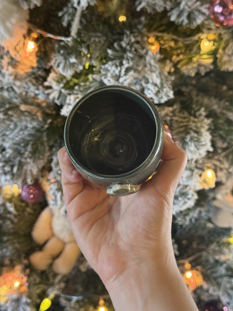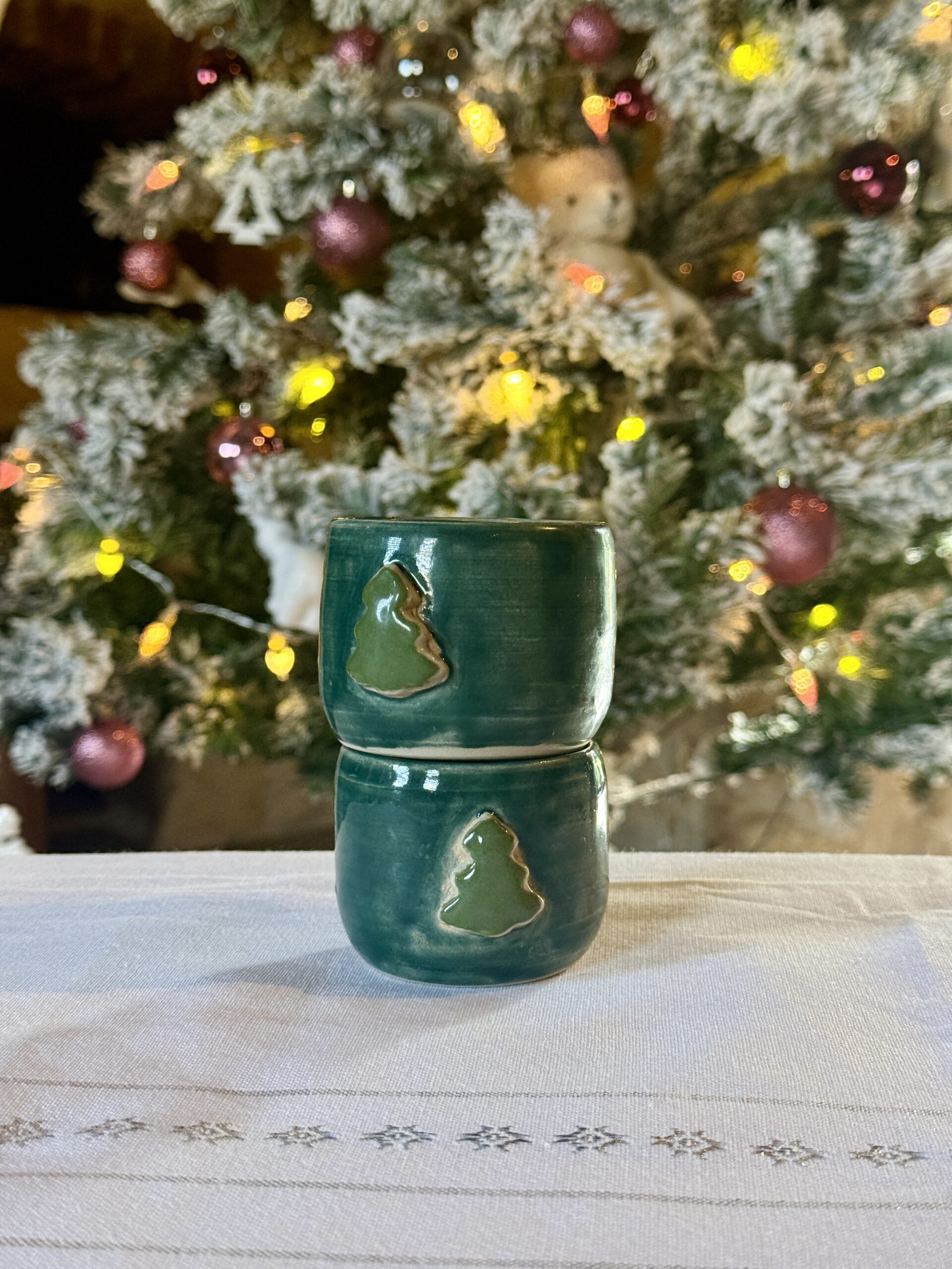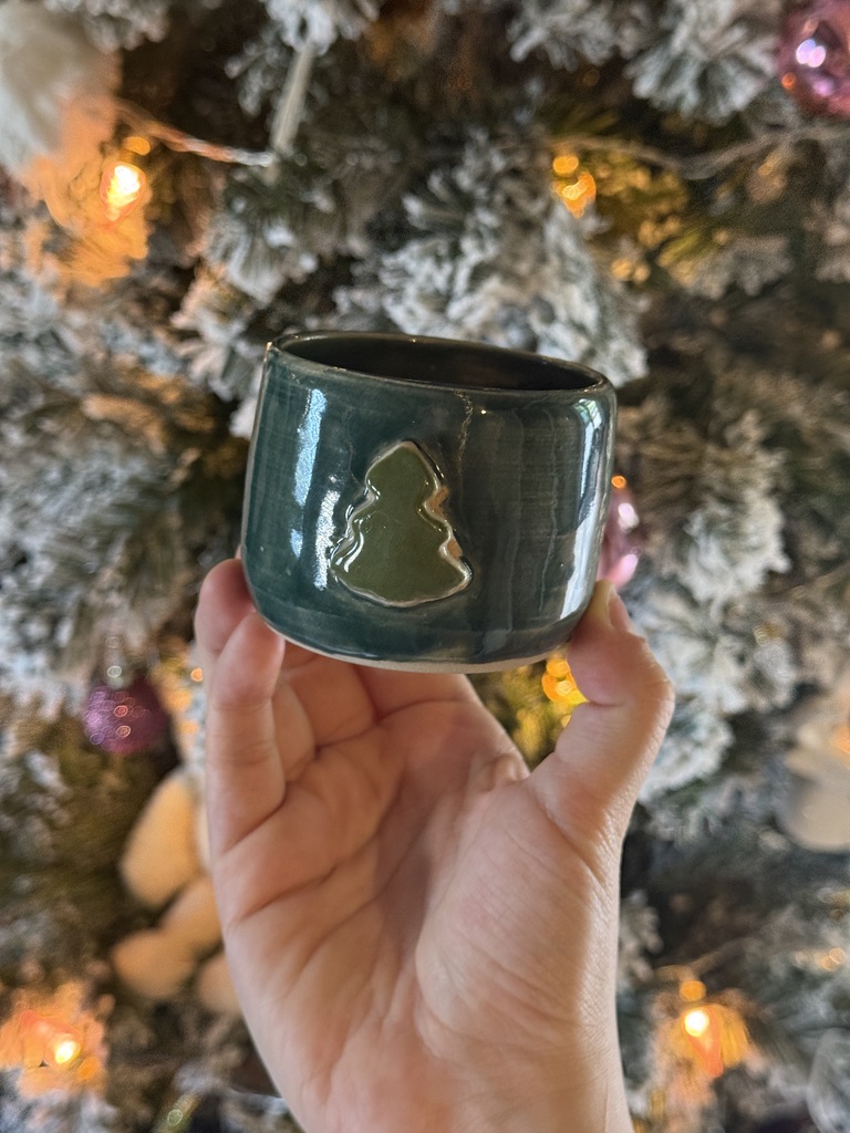 Tasse en céramique tournée à la main, avec un sapin en relief sur le devant.